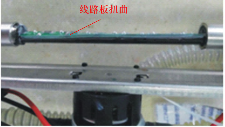 審查傳感器生產記錄時,發現該批故障件在生產時調整過PCB板在套管內的安裝角度,此舉是為了使干簧管遠離泵芯一邊,減小磁場對干簧管的干擾。由于調整PCB板角度時,其下部已經灌樹脂,樹脂已在逐漸固化,此時PCB板會受到外力扭曲,可能會造成干簧管損傷。拆解另一故障件時,發現PCB板明顯扭曲變形,如圖5所示,失效發生在3/4擋是因為該處的扭轉變形最大。
