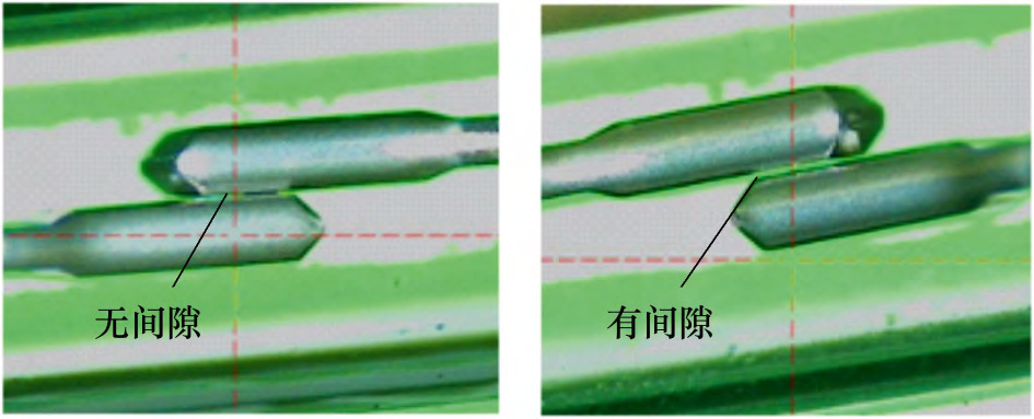 將失效的干簧管放入300倍放大儀下觀察,可以看見簧片觸點無間隙,而正常的簧片觸點則有可見間隙,如圖6所示。正常的干簧管在磁場靠近后,能觀察到簧片吸合動作,而失效的干簧管則無反應。
